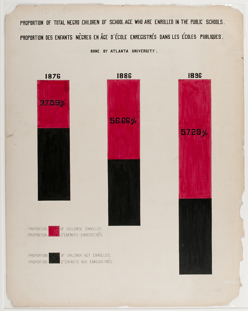 The goal of the this activity is to reproduce the visualization shown in Figure 1 (a), which displays the percentages of school aged Black children who are and are not enrolled public schools in the years 1876, 1886, and 1896.