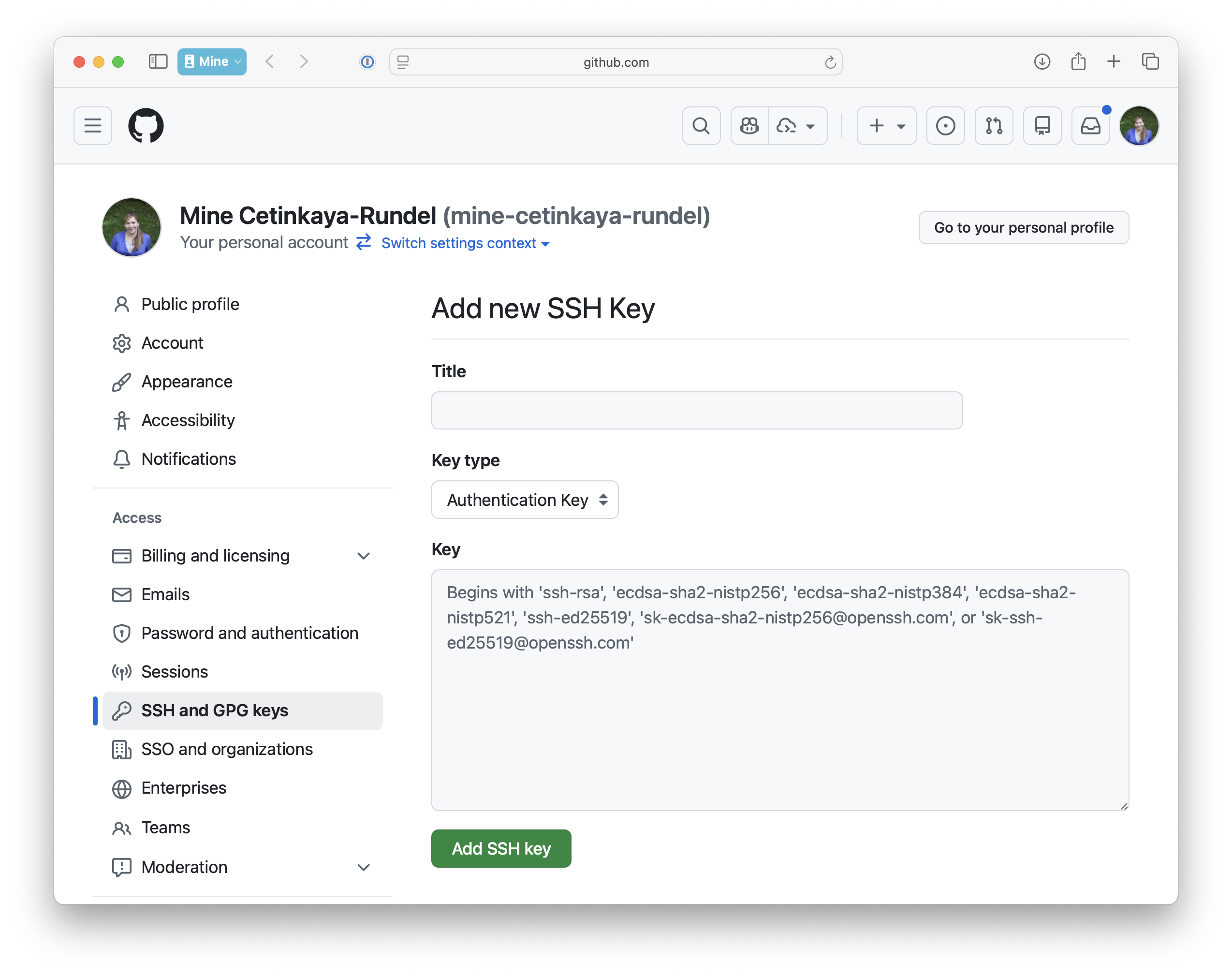 Once finished, you can click the green Add SSH key button. This key should now show in the list of GitHub SSH keys on https://github.com/settings/keys.