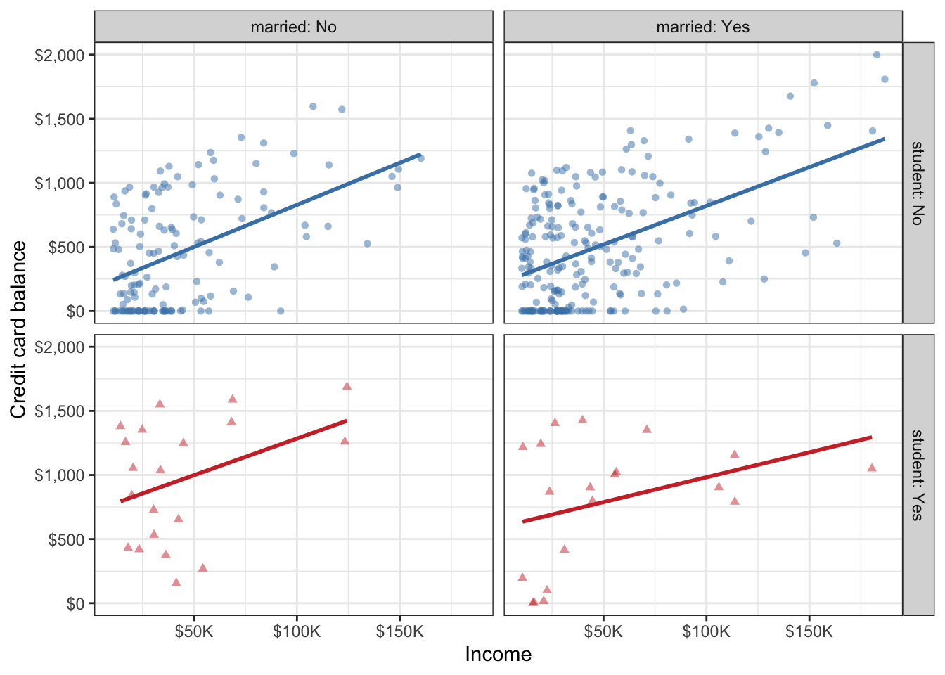 a. Recreate the following visualization. The only aspect you do not need to match are the colors, however you should use a pair of colors of your own choosing to indicate students and non-students. Choose colors that appear “distinct enough” from each other to you. Then, describe the relationship between income and credit card balance, touching on how/if the relationship varies based on whether the individual is a student or not or whether they’re married or not.