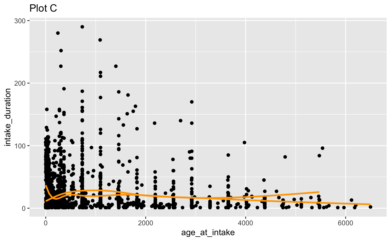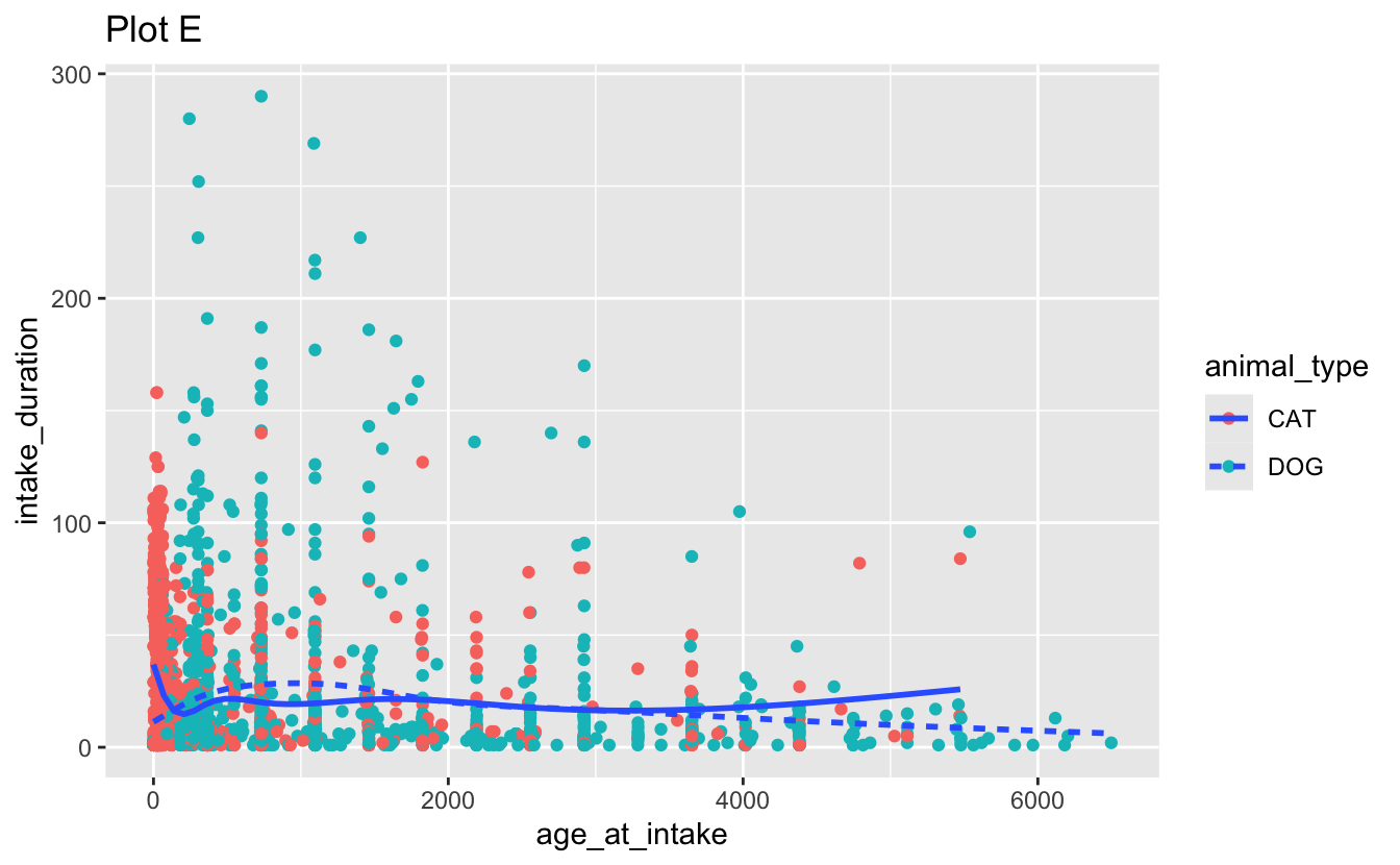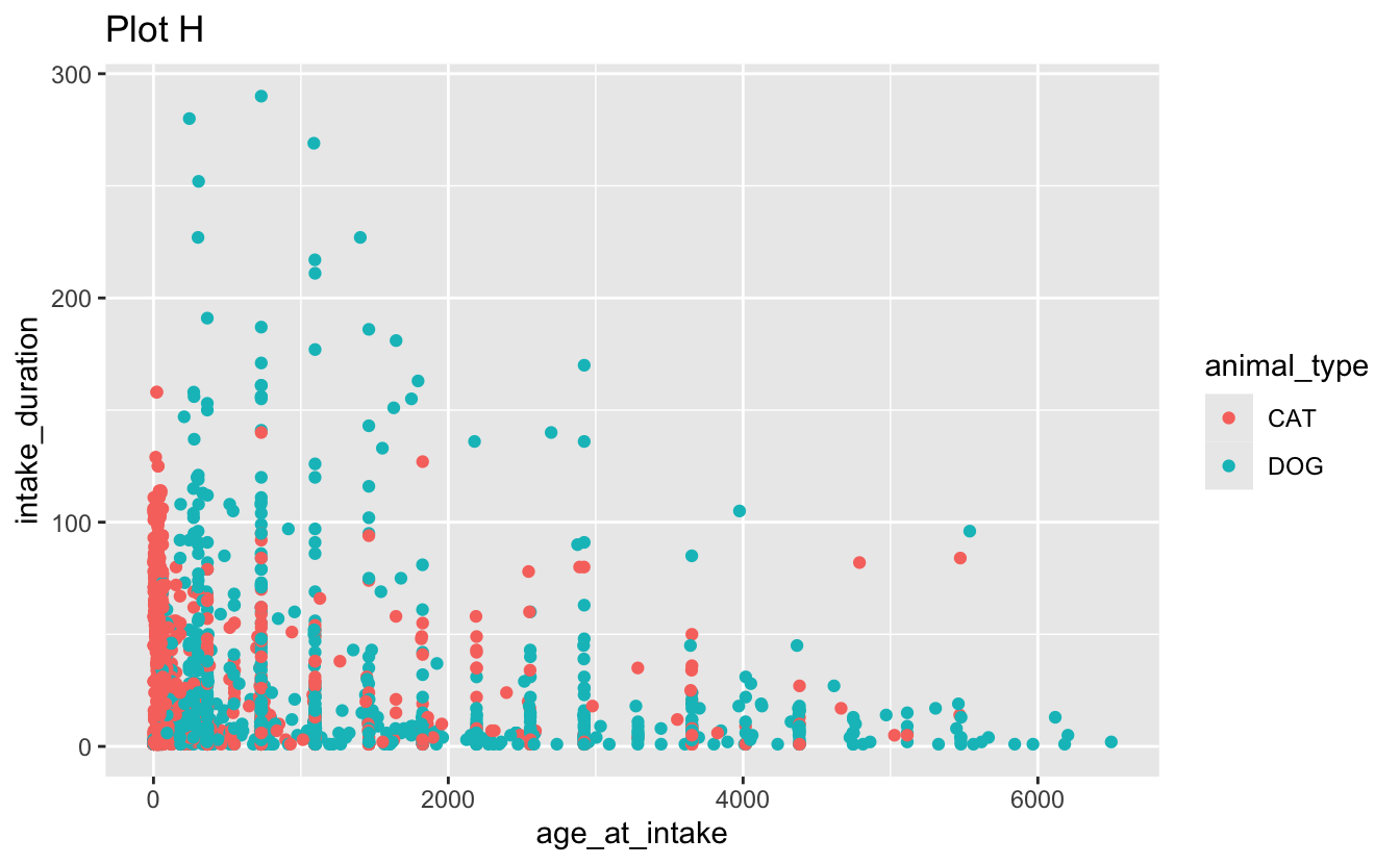facet_grid(. ~ outcome_type, scales = "free")d. Recreate the following visualizations. Note that wherever a categorical variable is used in the plot, it’s animal_type.