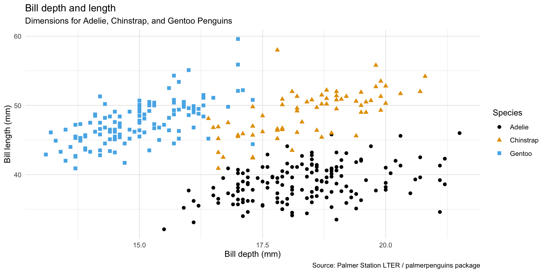 aes(x = bill_depth_mm, y = bill_length_mm, color = species, shape = species)) +