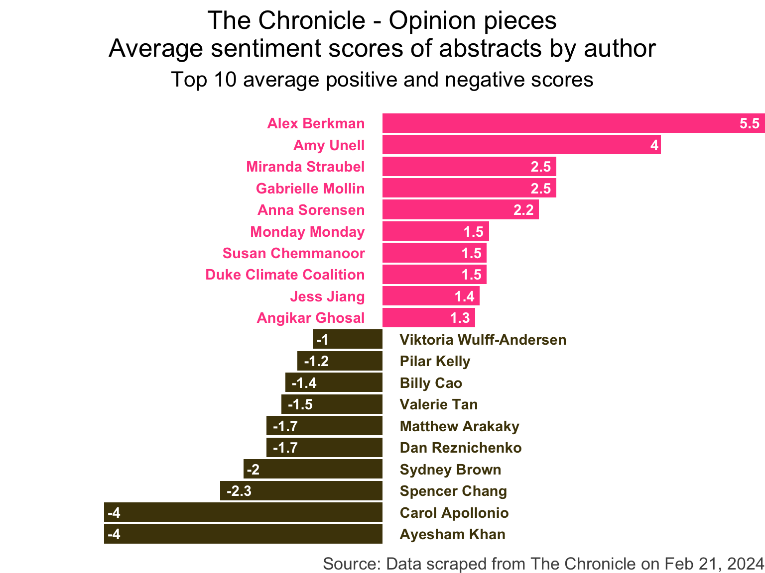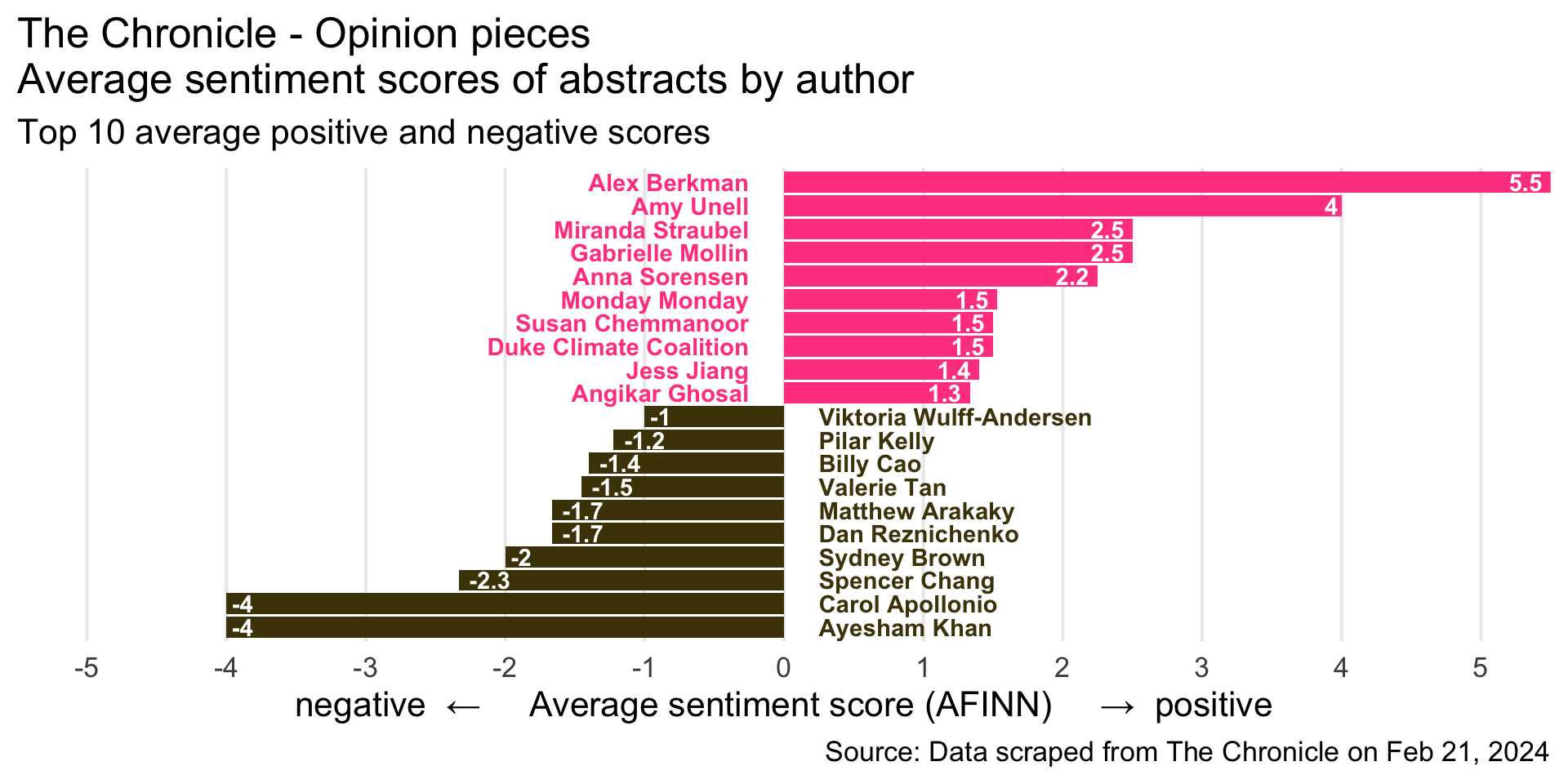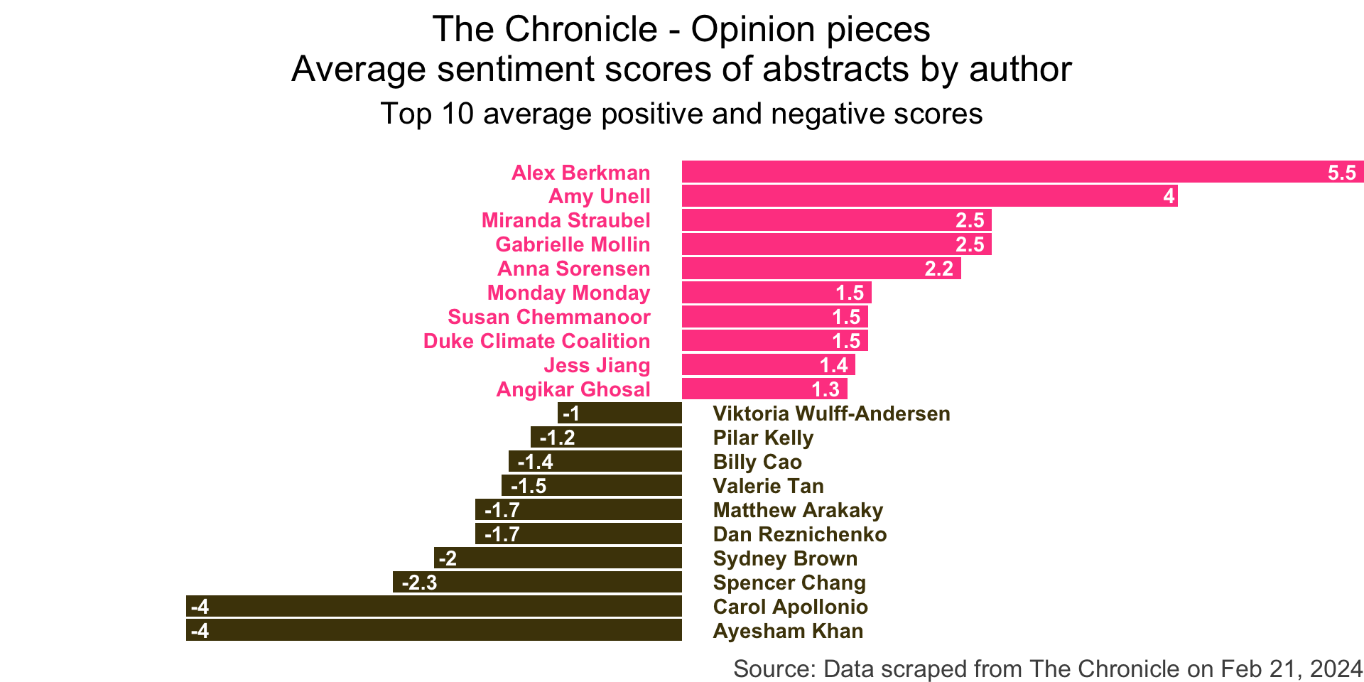 title = "The Chronicle - Opinion pieces\nAverage sentiment scores of abstracts by author",