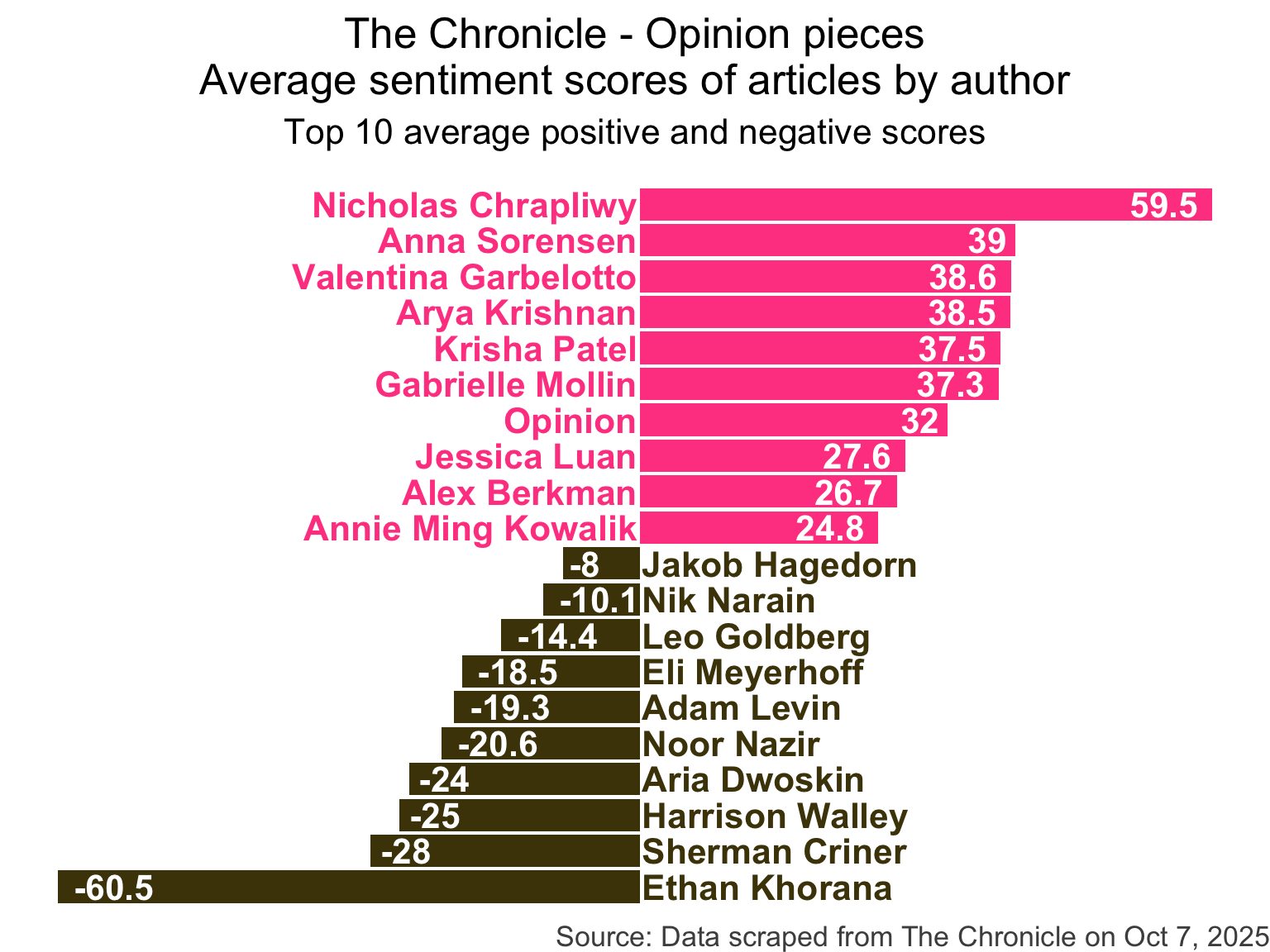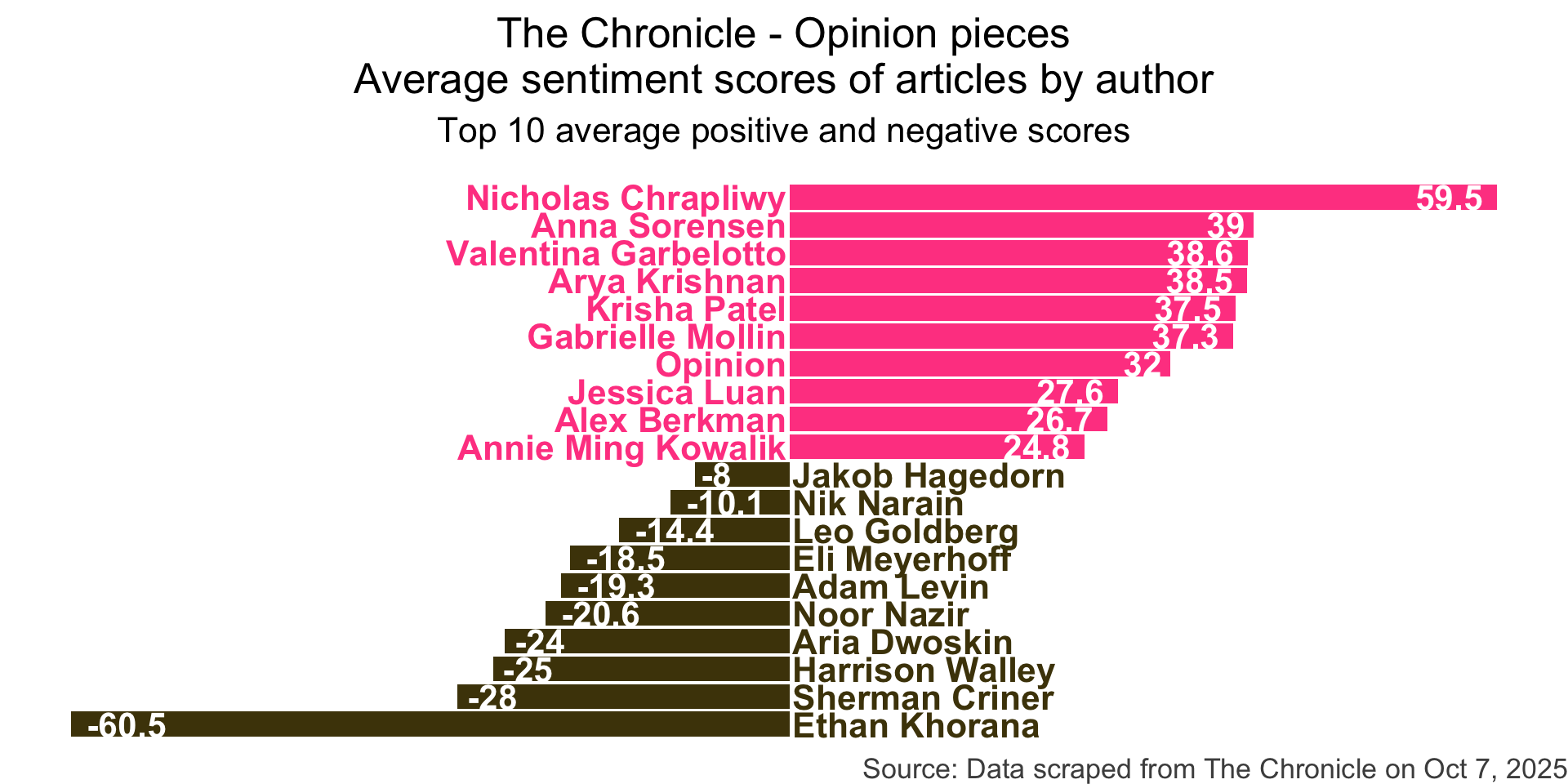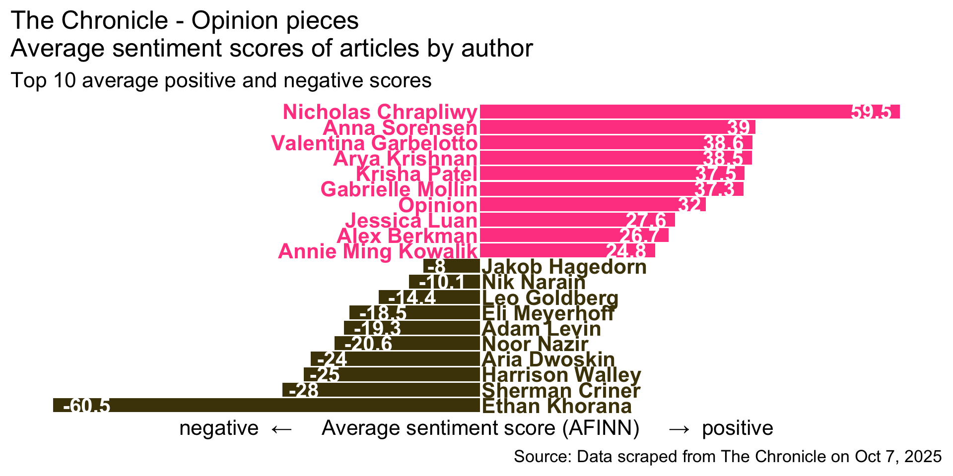 title = "The Chronicle - Opinion pieces\nAverage sentiment scores of articles by author",